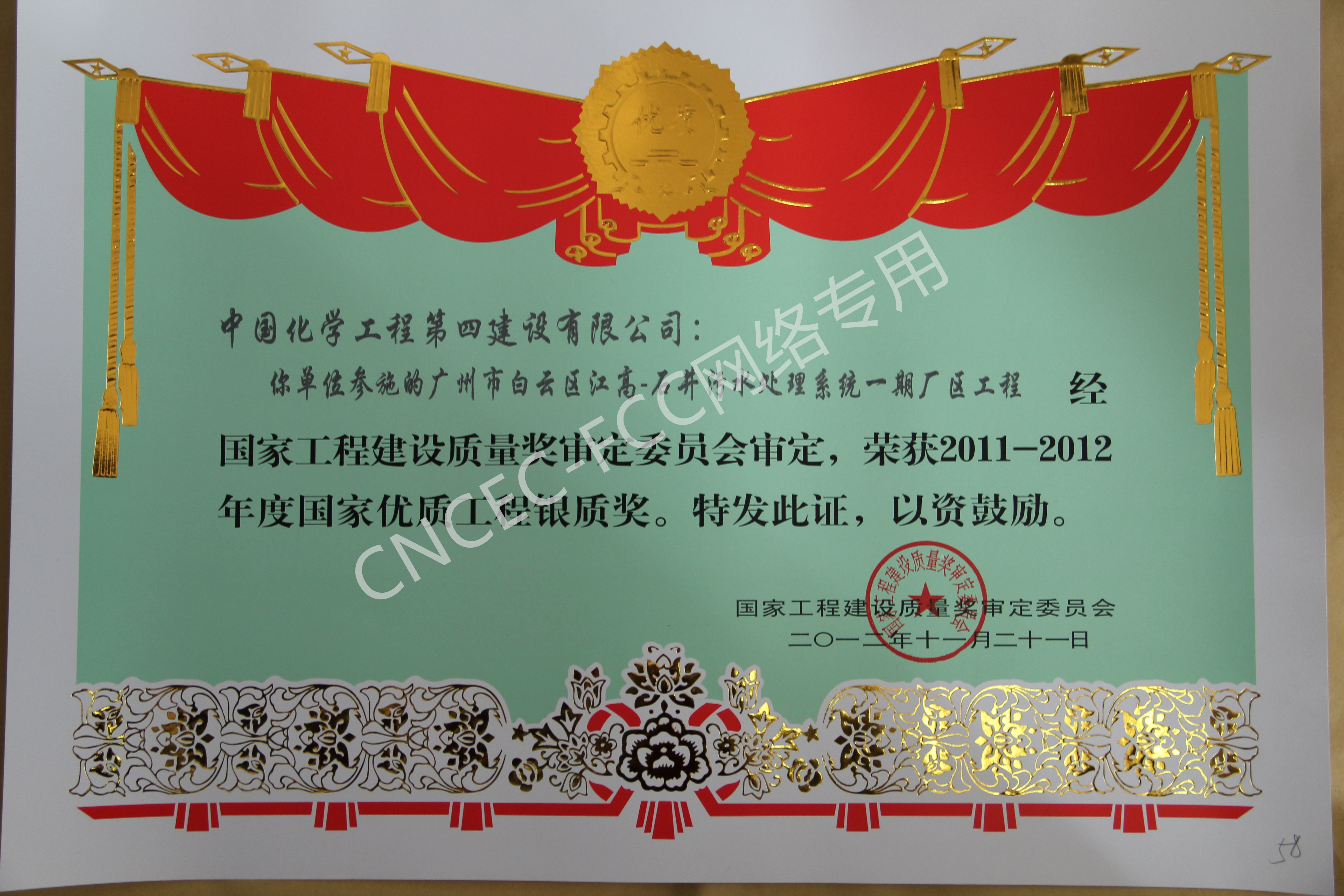 廣州市白云區(qū)江高-石井污水處理系統(tǒng)一期廠區(qū)工程國家優(yōu)質(zhì)工程銀質(zhì)獎(jiǎng)
