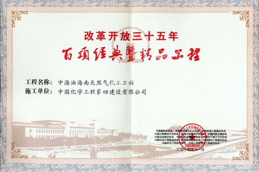 中海油海南天然氣化工工程改革開(kāi)放35年百項(xiàng)經(jīng)典工程獎(jiǎng)