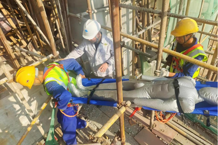 演練過程中,參演人員劃分為收集組、保障組、警戒組、聯(lián)絡(luò)組、搶救組,通過模擬突發(fā)“高處墜落”事故,項(xiàng)目部迅速啟動(dòng)應(yīng)急救援預(yù)案,快速、高效、有序?qū)嵤┚仍ぷ?,最大程度降低事故損失,有效減少人員傷亡和財(cái)產(chǎn)損失,維護(hù)施工人員生命安全。
