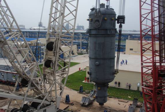 公司華錦項(xiàng)目部承建的遼寧北方化學(xué)工業(yè)有限公司20萬(wàn)噸/年環(huán)氧乙烷/乙二醇裝置工程(簡(jiǎn)稱EO/EG裝置)關(guān)鍵進(jìn)口設(shè)備泰國(guó)(larsen and Toubro Limited)制造的第一臺(tái)反應(yīng)器R-110,于2009年7月30日12:18分成功吊裝就位;第二臺(tái)R-120,于2009年8月5日11:18 成功吊裝就位。反應(yīng)器(R-110/120)是EO/EG裝置的核心設(shè)備,且為特大型的列管式固定床反應(yīng)器,該設(shè)備單臺(tái)凈重482噸,吊裝重量558.8噸。安裝時(shí),需起吊指設(shè)備底部高度必須超過(guò)20米后,再?gòu)匿摻罨炷量蚣芟蛳虏迦?,安裝在19.460米鋼筋混凝土框架梁上。