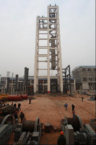 由一處承建的金象18·30合成裝置區(qū)合成氨裝置/醇烷化及氨合成工序需就位靜設(shè)備31臺,就位體積最大、重量最重、吊裝難度最大的要算氨合成塔這個龐然大物了,氨合成塔自重390噸,高25米,是山西金象煤化工有限責任公司18萬噸合成氨/30萬噸尿素工程(簡稱18·30工程)兩大主體形象工程之一。