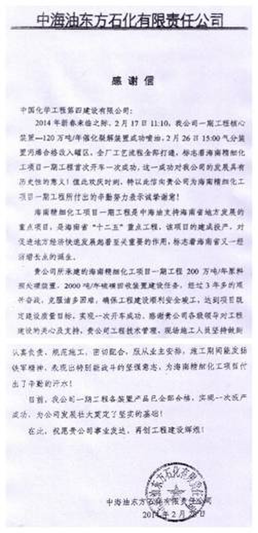 自2010年8月11日開工以來,項(xiàng)目部在分公司經(jīng)理陳文彬、項(xiàng)目經(jīng)理劉興陽的領(lǐng)導(dǎo)下,艱苦奮戰(zhàn)、精心組織、精細(xì)管理,工程整體形象良好、工程建設(shè)程序規(guī)范、質(zhì)量控制到位,于2013年9月28日按期順利實(shí)現(xiàn)機(jī)械竣工。通過投料試車,該項(xiàng)目達(dá)到一次試車成功、生產(chǎn)出合格產(chǎn)品的良好效果,受到了中海油東方石化有限責(zé)任公司的來信稱贊。