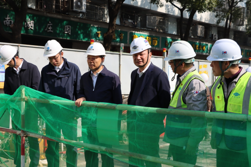 王殿常一行先后來(lái)到了項(xiàng)目部西瓜山濕地公園和求索西路雨污分流改造工程調(diào)研。彼時(shí)的西瓜山濕地公園湖水碧波蕩漾,岸坡綠草青青,改造后的西瓜山項(xiàng)目污澇同治、成效顯著,大家實(shí)地見(jiàn)證了從黑臭水體到“城市綠肺”的華麗轉(zhuǎn)身,開(kāi)園后將成為九華山片區(qū)周邊居民打卡休閑的好去處。另一處的求索西路雨污分流改造工程采用頂管施工技術(shù),作業(yè)人員正在進(jìn)行倒掛壁和頂管施工,通過(guò)新建污水管網(wǎng)打通“主動(dòng)脈”。該處為南津港片區(qū)污水主干管,收集南津港周邊污水,提高COD濃度,減輕南津港污水處理廠壓力,達(dá)到提質(zhì)增效的目的。