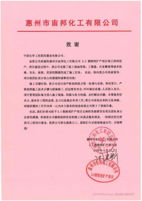 近日,公司收到惠州市宙邦化工有限公司發(fā)來的致謝信,信中對公司圓滿完成惠州市宙邦化工有限公司3.5期溶劑擴(kuò)產(chǎn)項(xiàng)目施工任務(wù)表示衷心感謝。
