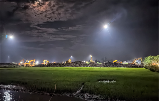 因第三道防線地處岳陽(yáng)市君山區(qū)良心堡鎮(zhèn)一個(gè)小村落,基礎(chǔ)設(shè)施極不完善,施工面臨村內(nèi)稻田、水塘、溝渠縱橫,高壓線、照明線架設(shè)高度不夠,搶建期間社會(huì)車輛、搶險(xiǎn)車輛密集通行,土方石方須遠(yuǎn)距離運(yùn)輸?shù)痊F(xiàn)實(shí)困難,公司不等不靠,多方協(xié)調(diào)、創(chuàng)新方法,有效克服了大型機(jī)械進(jìn)場(chǎng)難、場(chǎng)內(nèi)交通組織難、土方石方調(diào)配難、安全管理執(zhí)行難等難以想象的困難,比預(yù)期提前8個(gè)小時(shí)實(shí)現(xiàn)堤壩合龍。
