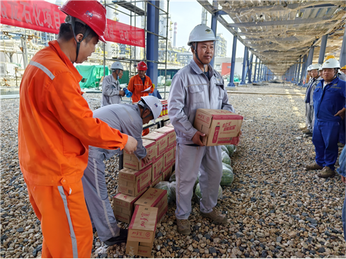 近日,湛江一體化項(xiàng)目部開展“情系一線送清涼、安全生產(chǎn)保安康”慰問(wèn)活動(dòng),為一線勞動(dòng)者送上了酸梅湯、藿香正氣水等防暑降溫物品,向他們的辛勤付出表示感謝,并叮囑大家要?jiǎng)谝萁Y(jié)合,在作業(yè)過(guò)程中采取有效的防暑降溫措施,確保暑期各項(xiàng)作業(yè)安全有序高質(zhì)量進(jìn)行。