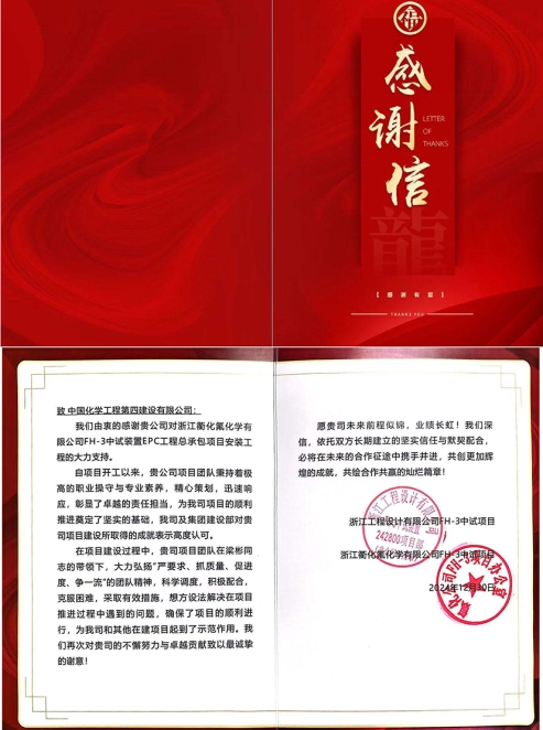 近日,華北公司收到浙江衢化氟化學(xué)有限公司及浙江工程設(shè)計有限公司發(fā)來的聯(lián)名感謝信,對衢化項目團(tuán)隊在項目建設(shè)過程中作出的積極貢獻(xiàn)表示感謝。