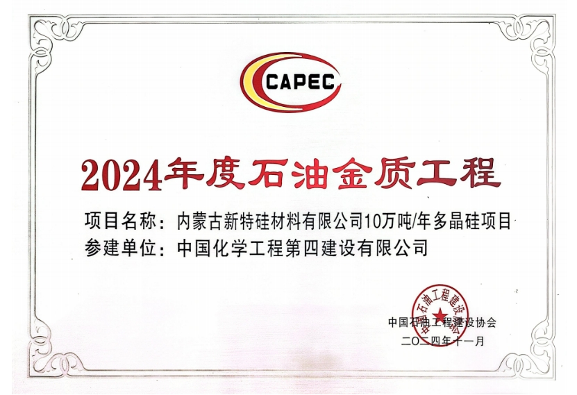 西部公司內(nèi)蒙古新特硅材料項目獲評2024年度石油金質(zhì)工程