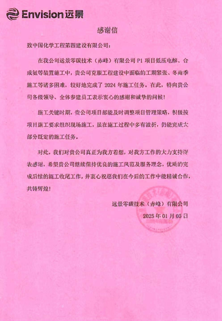 近日,東北公司收到遠(yuǎn)景零碳技術(shù)(赤峰)有限公司發(fā)來的感謝信,對東北公司安全優(yōu)質(zhì)高效完成各項施工任務(wù)給予高度贊揚與衷心感謝。
