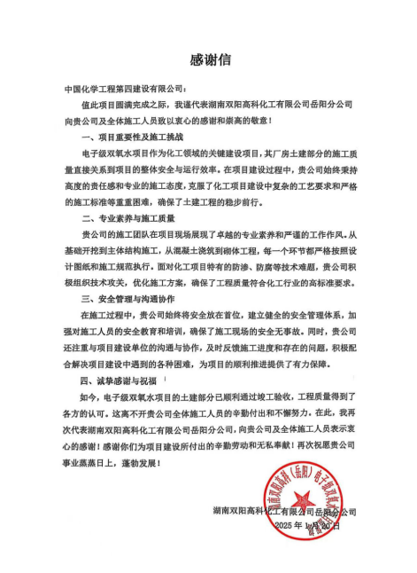 近日,建筑工程公司收到湖南雙陽高科化工有限公司岳陽分公司發(fā)來感謝信,對建筑工程公司在電子級雙氧水項目廠房土建施工中的突出表現(xiàn)給予高度認(rèn)可和衷心感謝。