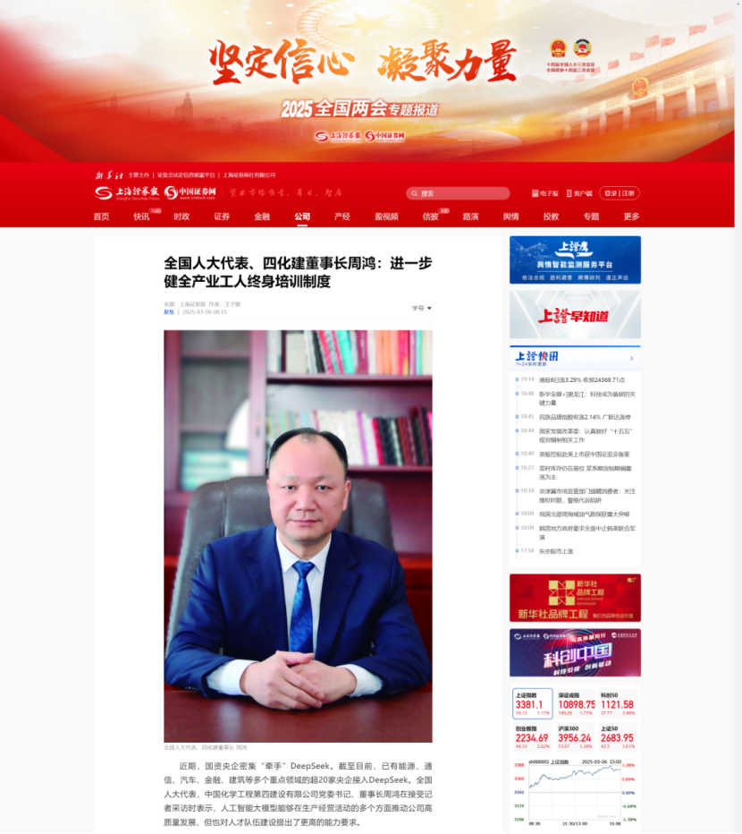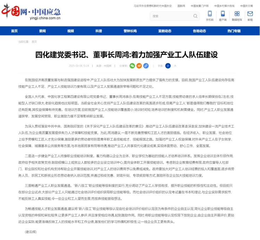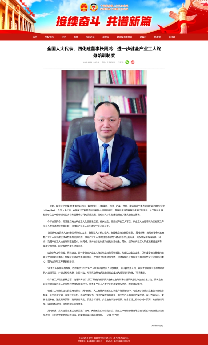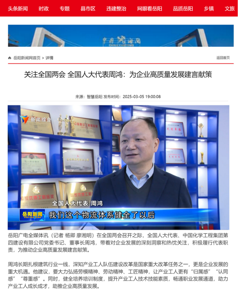 2025年全國兩會期間,全國人大代表,中國化學(xué)四化建黨委書記、董事長周鴻向大會提交《關(guān)于加強產(chǎn)業(yè)工人隊伍建設(shè)的建議》《關(guān)于多措并舉解決拖欠建筑施工企業(yè)工程款的建議》《關(guān)于推動洞庭湖區(qū)常岳九鐵路、荊岳鐵路、監(jiān)利至華容至益陽鐵路規(guī)劃建設(shè)提速的建議》《關(guān)于修改最高法院〈關(guān)于大型企業(yè)與中小企業(yè)約定以第三方支付款項為付款前提條款效力問題的批復(fù)〉的建議》等4條建議,受到主流媒體深入報道,引起社會各界廣泛關(guān)注。
