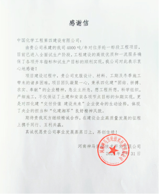 近日,由江西公司承建的4000噸/年對位芳綸一標(biāo)段工程項(xiàng)目全面進(jìn)入試生產(chǎn)階段。項(xiàng)目團(tuán)隊(duì)?wèi){借高效履約能力與卓越服務(wù),贏得業(yè)主單位河南神馬芳綸技術(shù)開發(fā)有限公司的高度認(rèn)可,并發(fā)來感謝信,肯定團(tuán)隊(duì)的專業(yè)實(shí)力與責(zé)任擔(dān)當(dāng)。
