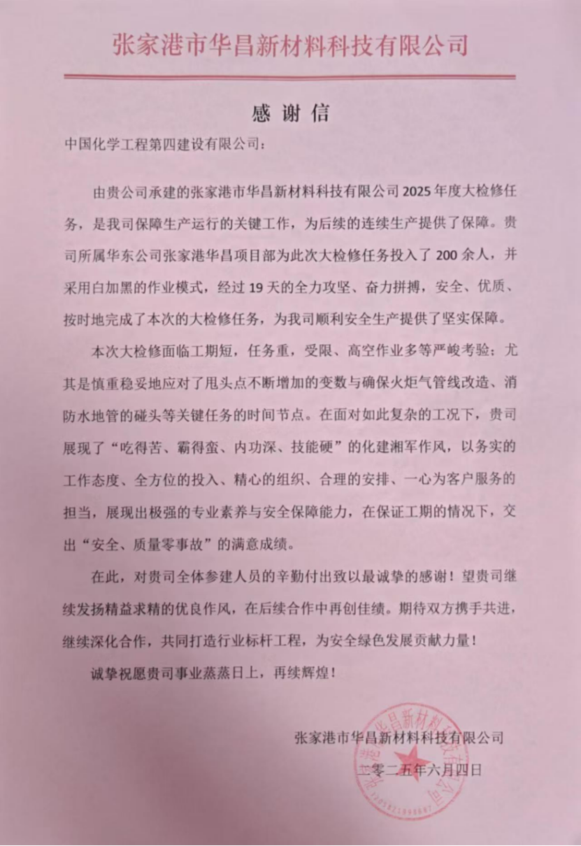 近日,江蘇華昌新材料科技有限公司向公司發(fā)來感謝信,對華東公司在張家港華昌2025年度零星維修及技改技措項目大檢修中的突出表現(xiàn)給予高度贊揚和衷心感謝。