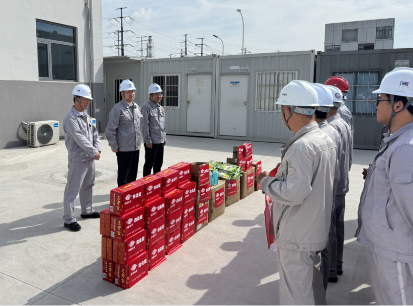 在榮盛金塘新材料項(xiàng)目,張勇、胥正旺向奮戰(zhàn)在高溫一線的員工送去鹽汽水、王老吉、防暑藥品等慰問品,致以殷切問候并感謝他們?cè)诹胰障碌膱?jiān)守。在項(xiàng)目現(xiàn)場(chǎng),張勇仔細(xì)查看工程進(jìn)展與安全生產(chǎn)情況,肯定項(xiàng)目取得的工作成效,強(qiáng)調(diào)要科學(xué)調(diào)整作業(yè)時(shí)間、落實(shí)防暑預(yù)案,確保實(shí)現(xiàn)“零中暑、零事故”;叮囑員工增強(qiáng)防護(hù)意識(shí)、勞逸結(jié)合,以飽滿的精神狀態(tài)打贏高溫攻堅(jiān)戰(zhàn)。