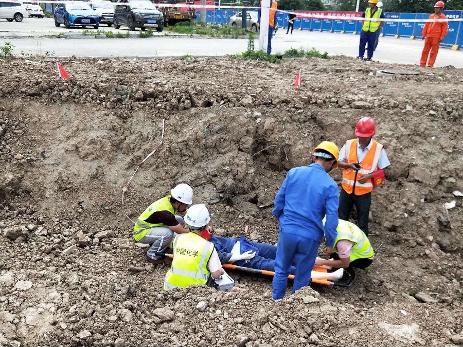 演練開始,現(xiàn)場人員向總指揮報告事故發(fā)生及人員被埋情況,并迅速安排各個救援小組分別進(jìn)行救援。根據(jù)應(yīng)急預(yù)案,各應(yīng)急救援組成員收到救援命令后,立即投入到搶險救援工作中去。安保組安排人員封鎖道路,設(shè)專人指揮交通,保障現(xiàn)場救援通道暢通;技術(shù)保障組及時勘察事故實際情況,避免發(fā)生二次坍塌事故;物資保障組及時提供搶險救援物資;醫(yī)療組緊跟搶險組趕赴現(xiàn)場,迅速展開救援活動,將“獲救”人員用擔(dān)架抬至空曠地帶,進(jìn)行初步包扎和搶救直至救護(hù)車到達(dá)。