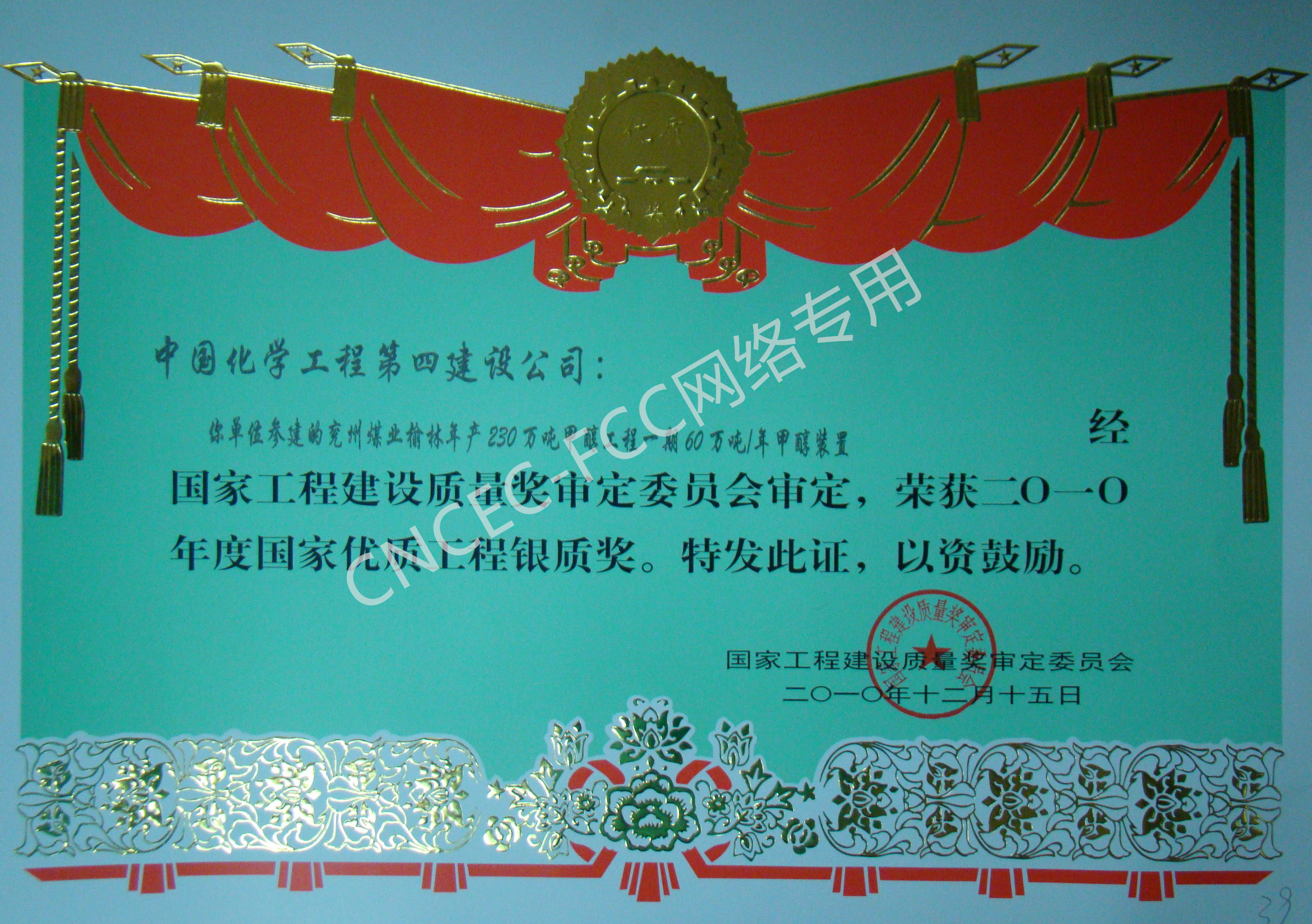 兗州煤業(yè)榆林年產(chǎn)230萬噸甲醇工程一期60萬噸年甲醇裝置國家優(yōu)質工程銀質獎